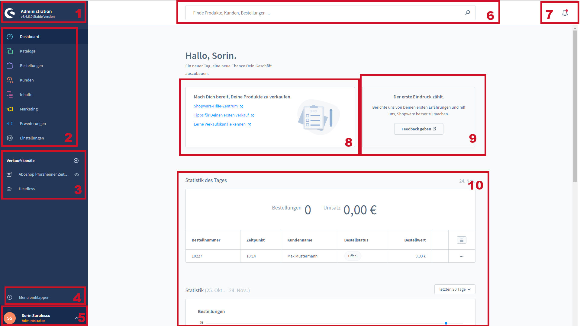 Darunter befinden sich die einzelnen Bereiche, in denen Du Shopware konfigurieren kannst (2).